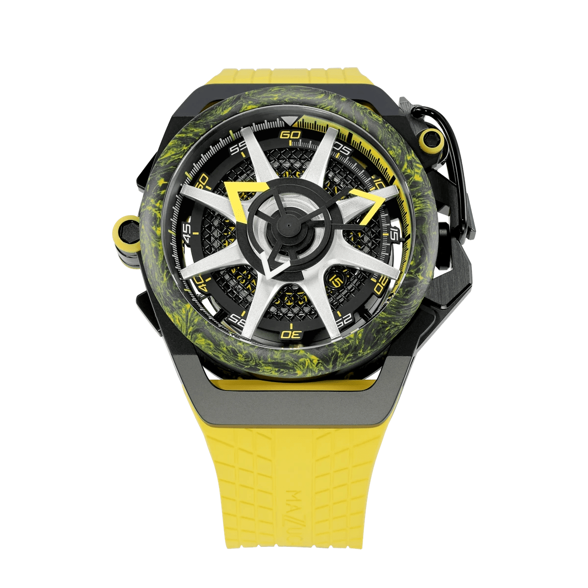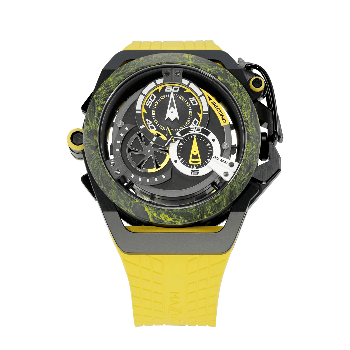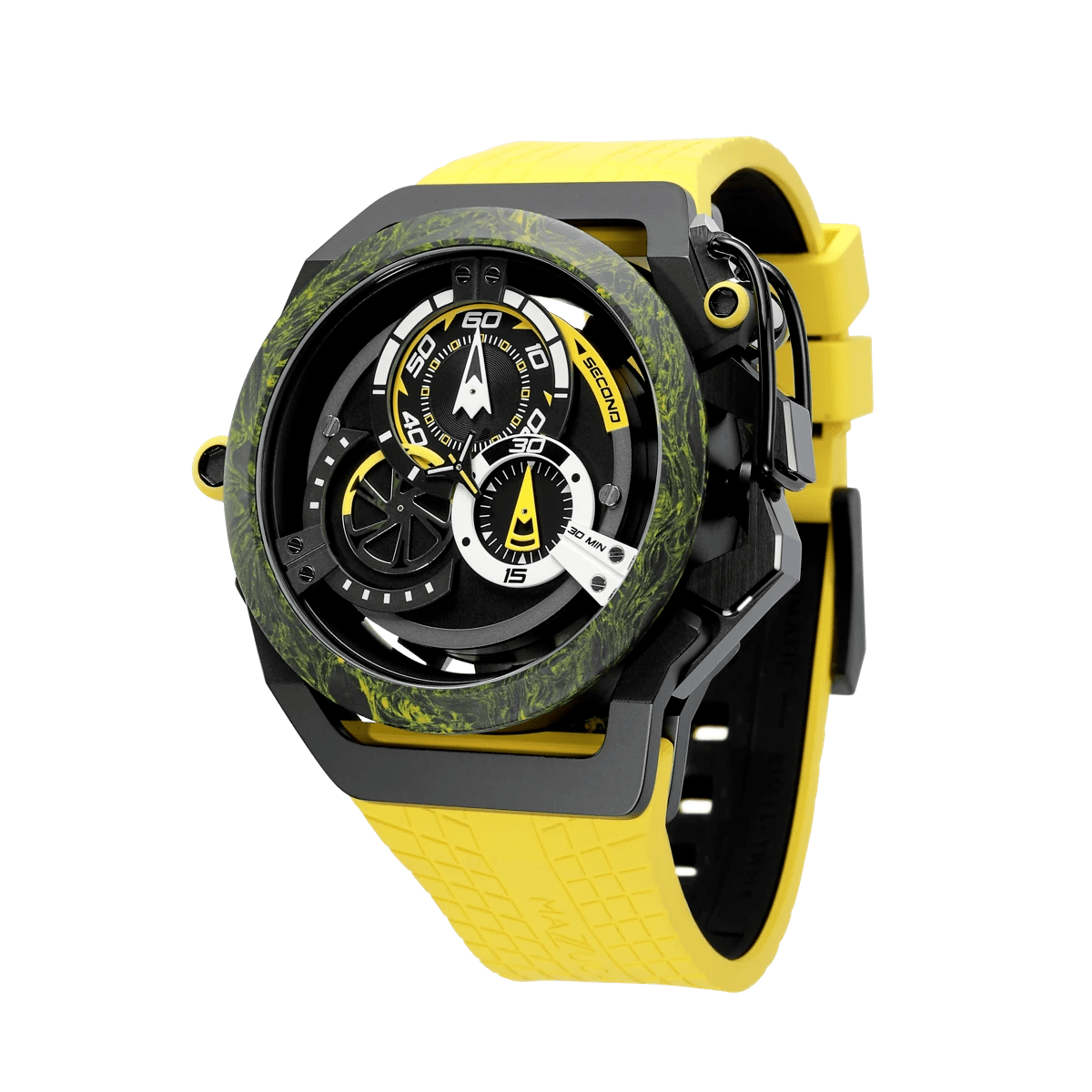 El nuevo R.I.M. Sport Monza es el modelo más extremo y deportivo de la familia Sport. Con un diseño más nuevo y una fibra de carbono construida, representa el reloj de carreras más avanzado y deportivo hasta la fecha. Como todos los demás relojes del R.I.M. familia, es reversible con una esfera dual para funciones de reloj deportivo y cronógrafo.
