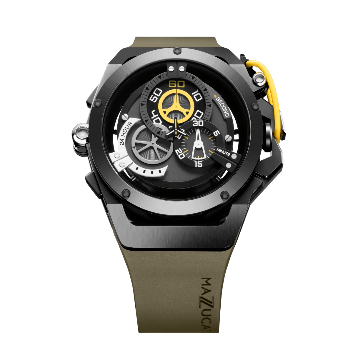 Funciones de la esfera del cronógrafo: manecilla de segundos central, contador de 12 horas (cronógrafo de 60 segundos), contador de 4 horas (cronógrafo de 30 minutos), contador de 8 horas (indicador de 24 horas)