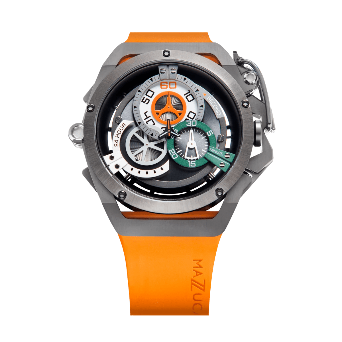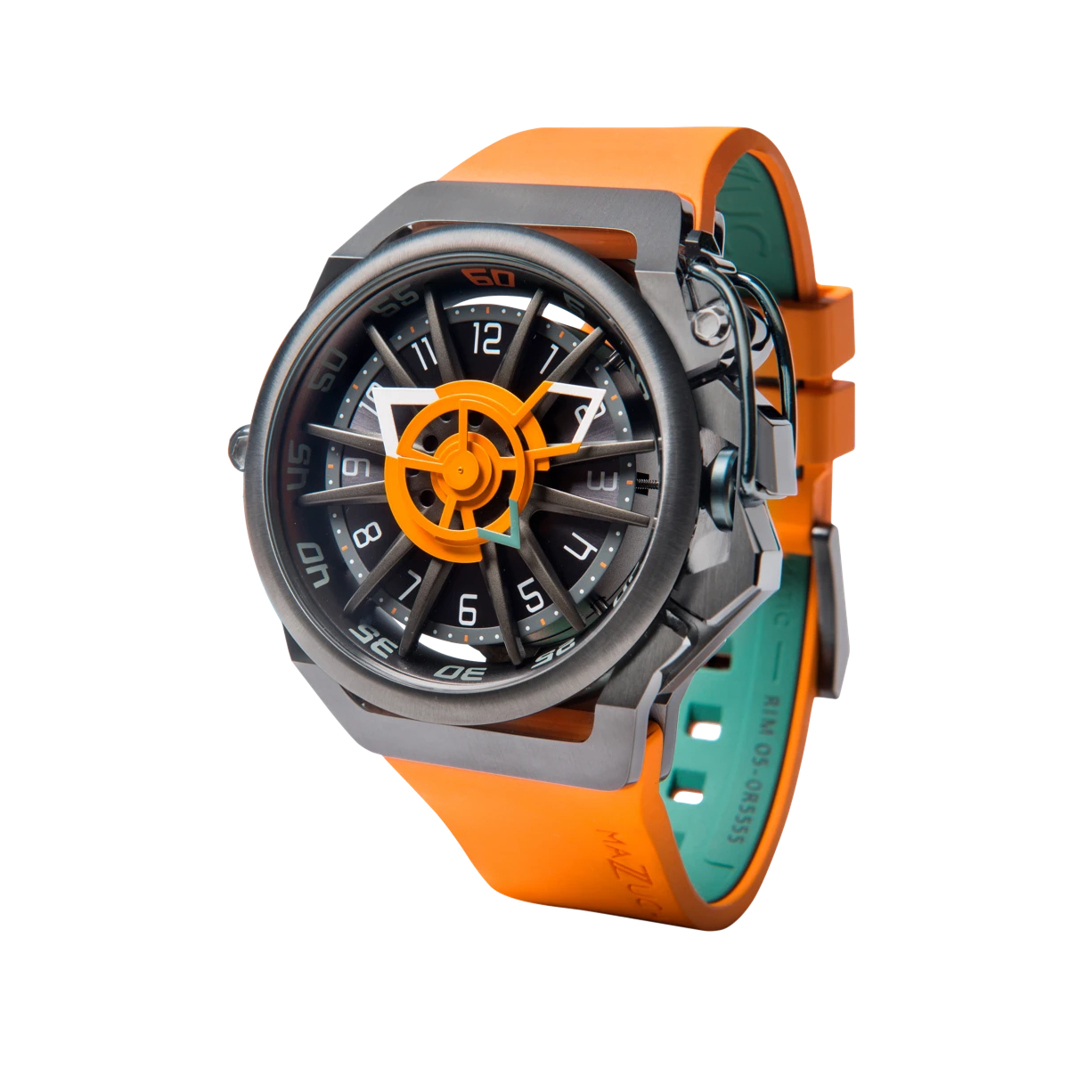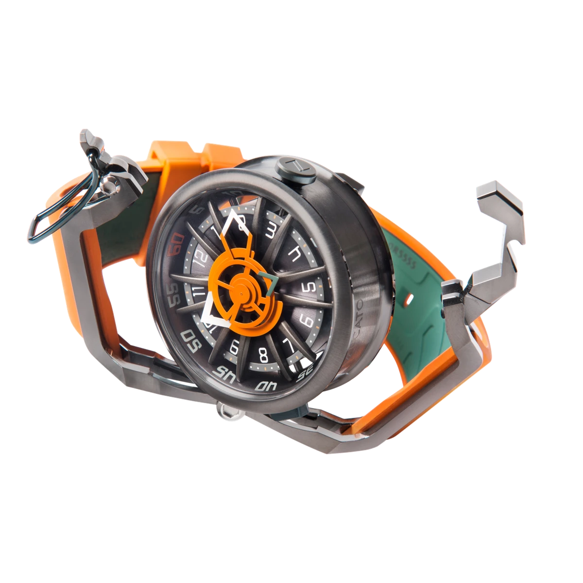 El sistema inverso permite que la caja se invierta completamente en ambas direcciones. Un pestillo de liberación rápida libera la corona de su protección al girar el protector de corona. Dos brazos especiales permiten que el estuche gire libremente y un clic claramente reconocible le indica cuándo el estuche está en la posición correcta para volver a bloquearse en su lugar. Una simple maniobra transforma el RIM Sport en un reloj cronógrafo elegante y deportivo.