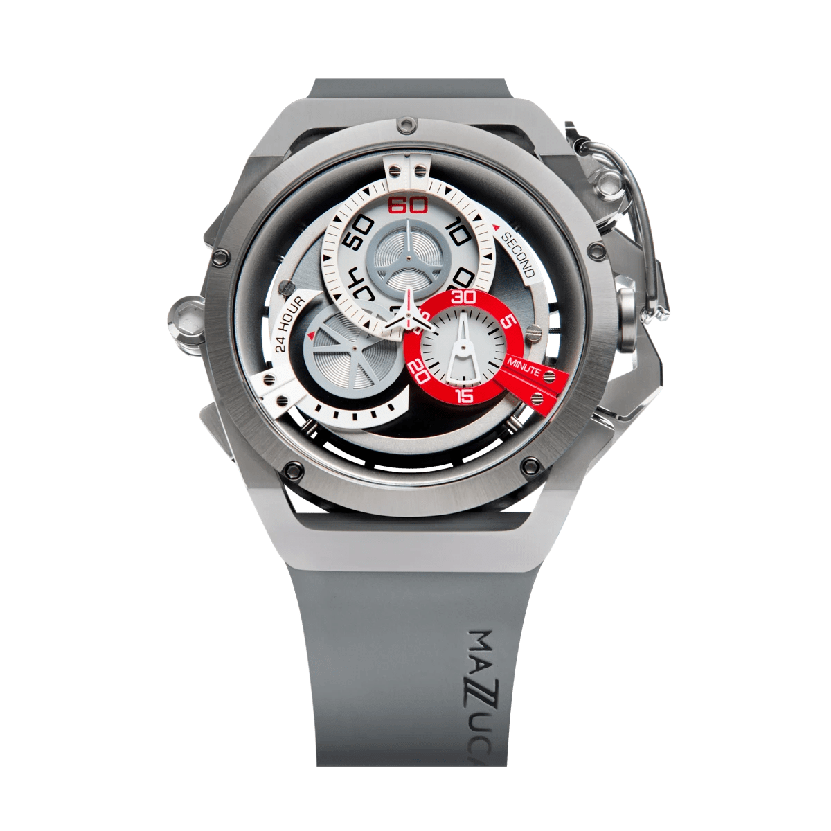 Funciones de la esfera del cronógrafo: manecilla de segundos central, contador de 12 horas (cronógrafo de 60 segundos), contador de 4 horas (cronógrafo de 30 minutos), contador de 8 horas (indicador de 24 horas)
